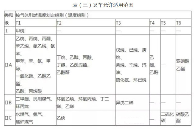 對(duì)于I、II區(qū)爆炸性氣體環(huán)境表(三)為叉車(chē)允許適用范圍,表(四)為危險(xiǎn)區(qū)域的溫度組別劃分。
