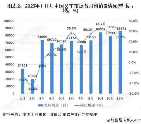 2020年受益于國內新冠疫情得到迅速控制,國內制造業(yè)、物流業(yè)的快速恢復,叉車市場需求快速增長。2020年1-11月份的累計銷量達到72.56萬輛,與2019年同期相比增長30.3%。