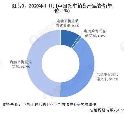 叉車主要分為四類,包括內燃平衡重式叉車、電動平衡重叉車、電動乘駕式倉儲叉車、電動步行式倉儲叉車,分別對應歐美分類標準的IV/V、I、II、III類叉車。從2020年1-11月份的銷售結構來看,內燃平衡重式叉車和電動步行式倉儲叉車占比最高,分別為49.7%和39.5%。