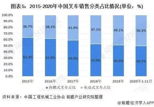 從2015-2020年中國叉車銷售分類占比情況來看,電動式叉車的銷量占比逐年提升,從2015年的36.7%提升至2020年1-11月份的50.3%。主要是受到環(huán)保政策及室內作業(yè)環(huán)境要求的驅動作用,電動叉車需求持續(xù)增長。另外,根據(jù)中國工程機械工業(yè)協(xié)會資料顯示,在發(fā)達國家的叉車銷售結構中電動叉車占比均超60%,未來我國電動叉車比例將持續(xù)提升。